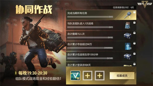 本次游戏官方推出了协同作战的活动,在整个活动期间,玩家都可以和自己的好友进行组队,然后以组队的模式进入战场,以组队模式进入战场的玩家都是有机会捡到翻倍掉落的现金的,而且如果玩家在游戏里面能够和自己的好友成功撤退的话,还能够获得翻倍的结算经验,本次游戏活动持续到9月26日,并且会在每天晚上的七点半到八点半之间开启活动。