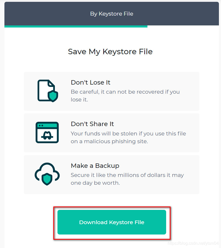 确认并理解系统提示的安全信息后,点击“Acknowledge & Download”按钮下载Keystore文件。将文件保存在安全的位置,并备份到多个存储介质以防丢失。