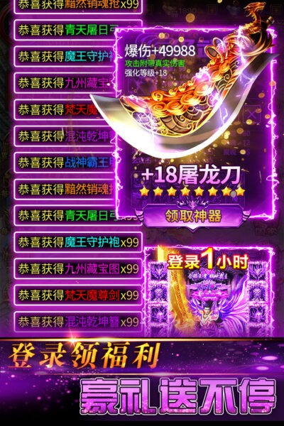 丰厚登录福利:登录即送羽翼戒指、冰皇圣剑、至尊特权等豪华礼包,登录1小时更可领取+18屠龙刀等稀有神器。