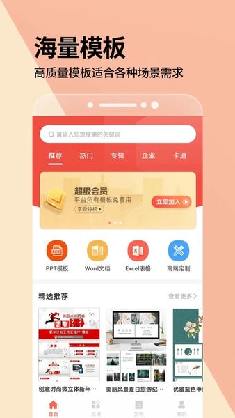 机端PPT创建、编辑、制作应用,可以进行PPT幻灯片制作、word文档编辑、excel表格制作等office全套功能,同时支持PDF图片格式转换,pdf阅读器功能。PPT一键制包含丰富Powerpoint演示、ppt模板、word文档、Excel表格等Office办公模板以及文档格式之间转换,适用于不同场景办公需求,高效提升办公,让高质量的演示文稿变得更简单,操作使用简洁、功能齐全。