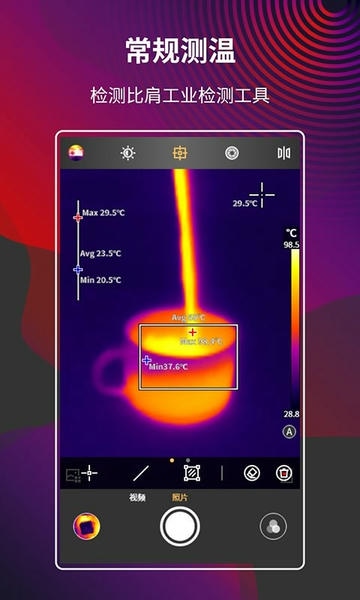 在实时视频模式下能实时测温、切换调色板(含自定义调色板)、拍照、录像、参数设置、分析对象、图片和视频浏览、对照片进行再分析、回放视频、云功能和多语言等功能。您可以使用这款app记录下生活中每一刻的温度!