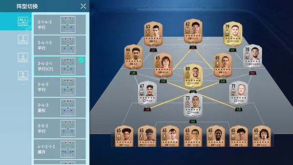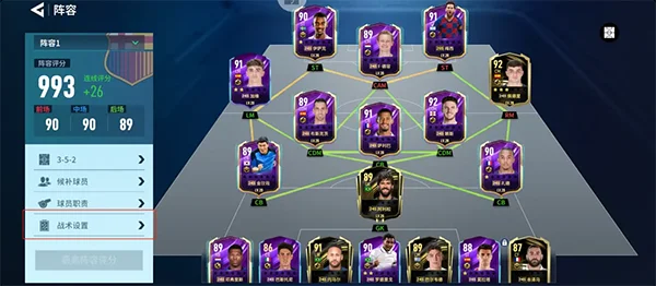 6、游戏内球员有着丰富的阵型可以切换,切换后可以重新评分,评分越高阵容强度就越高。