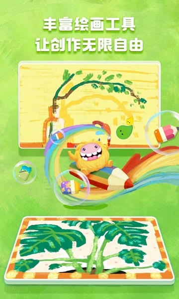 绘画主题每月更新,主题内角色阶梯式难度递增,不定期为孩子开放铅笔、水彩、油画、蜡笔、墨水笔、马克笔、织物等12种丰富多样的绘画工具,助力孩子自由创作,无限想象;