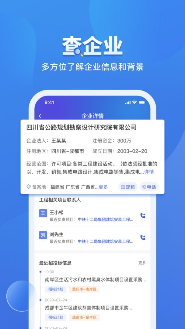 提供全国建筑企业的中标信息,企业荣誉,资质等级,联系方式等信息的查询,不管您在开标现场,还是在工地,或者是出差的路上,您都能随时随地查询到建筑企业的相关信息。