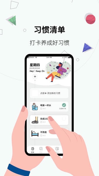坚持打卡的习惯养成类APP,自定义发起一个习惯目标,每天打卡签到,提高自律性,提高工作效率,专注养成好习惯!