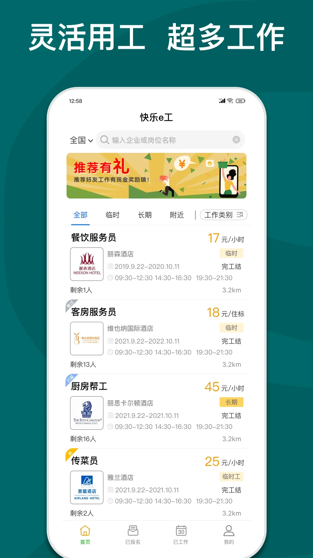 快乐e工是由北京互联维高科技有限公司投资开发的兼职软件产品,她主要是为星级酒店提供兼职帮工,为在职酒店员工谋求兼职收入及职业发展机会的网络平台。平台采取精准定位、精准推广、精准维护方式,通过网络技术创建酒店与员工公共桥梁,帮助酒店解决人力资源及降低人工成本问题,充分挖掘利用劳动力闲置价值,为酒店员工增加收入、拓宽视野及寻求发展机会,提供可实现的路径。同时注重为员工创建网络平台文化,为员工创造快乐工作乐园。