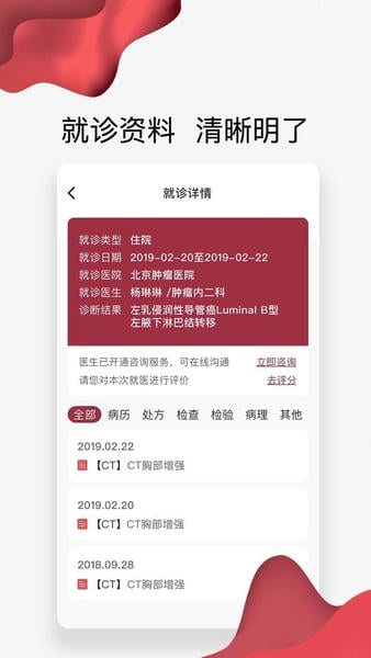 朝阳健康云,只需绑定您的医保卡,就能随时随地查看您在朝阳医院的病历、处方和检验检查报告;您在医院就诊后,云病历将自动帮您获取就诊所包含的病历、处方和检查报告,及时同步到您的手机中并智能化归档,方便回顾与查阅.