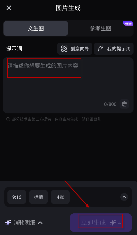 2、然后描述想要生成的图片,点击下方的“立即生成”选项。