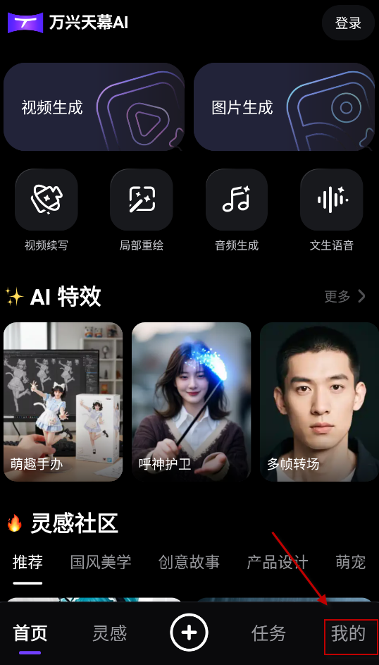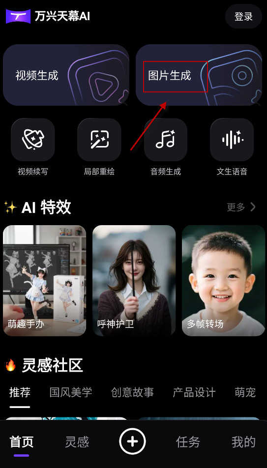 在首页选择“文生视频”“图生视频”“文生图”或“音频生成”等入口,根据当前创作需求进入对应功能页面。