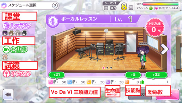 试镜共有三种。建议大家别参加难度最低的一个。这是因为每一次试镜都会导致一周时间过去,而每次升级期限却只有短短八周。难度最低的一个获取的粉丝数极少,要挑战约4-5次左右才能获取升级要求的粉丝数。反而,难度第二的只需要进行2次,最高难度的只需要1次。故此不建议挑战最低难度的试镜,宁可把时间用作训练偶像上。