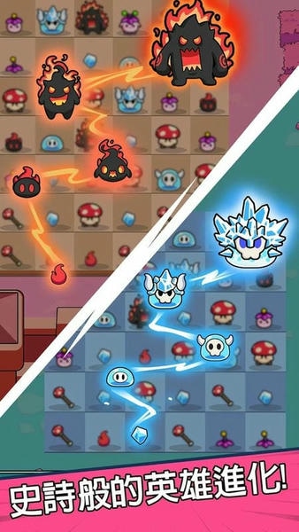 菇勇者破解版游戏是款以合并消除升级为基础的战斗类手机游戏,为玩家带来q版的蘑菇怪物角色形象,通过拖动三消合成升级的方式,解锁更多高阶怪物,和boss进行战斗!