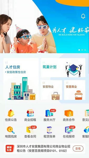由深圳市人才安居集团旗下深圳市房屋租赁运营管理有限公司开发及运营,系聚焦住房租赁、商业招商、物业服务和生活服务四大核心板块的移动互联网平台,向用户提供地图找房、预约看房、在线签约、合同查询、在线缴费、在线报修、物业服务、生活服务、大厅预约排队等丰富的互联网线上服务。
