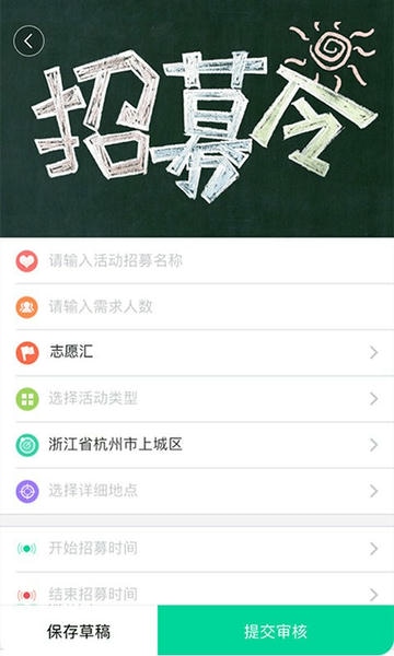 1. 招募管理:创建公益活动,通过审核后,志愿者便可在“志愿汇”用户端了解报名活动;