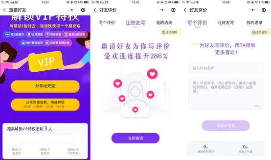 6、拓客机制除了付费解锁VIP特权外,还可以通过邀请三个好友解锁特权。三个用户换价值88元的VIP,获客成本降到了不到30元,但基于VIP的虚拟道具性质,其实获客成本降到了0。但我不得不说一句,如果一个产品没有让用户体验到一点好处就让他去转发邀请获客,那么这个社交裂变的几率不会很高。