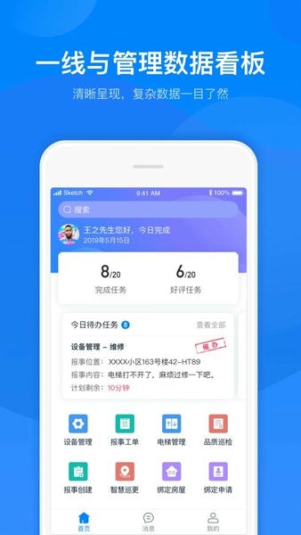 在工作台可以查看任务进展,任务类型:绑定申请、保姆、智能硬件报事、报事报修、巡检;方便管家及时高效的处理业务,从而提升了业主的服务满意度。