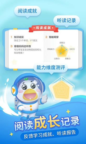4、宝宝阅读成长记录:及时反馈每本书阅读成就:知识点、亲子阅读建议等。每月生成宝宝听读数据报告,成长看得见。