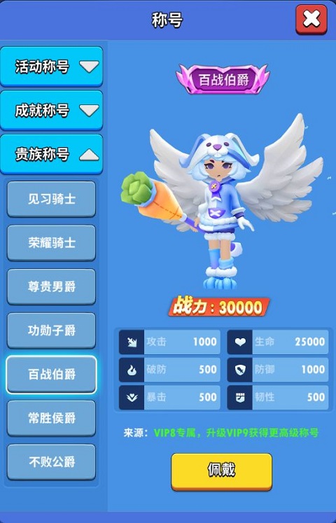 参加骑士荣耀、迷途之塔、竞技场等活动可以获得活动称号,成就称号需要你完成任务目标获得,贵族称号需要达到一定VIP等级获得,获得多种称号可以提高战力。