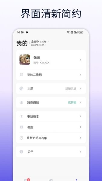 个人中心一目了然:我的页面集成账号信息、我的二维码、主题、版本更新、重启应用与关于等常用功能,维护更便捷。