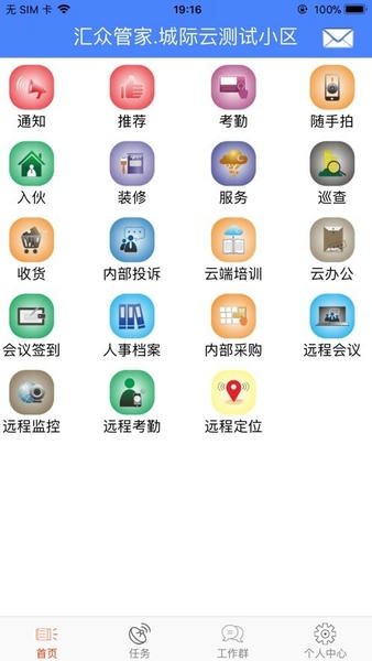 有查看企业内部实时信息、个人实时消息、考勤、会议签到、云办公审批文件、查询巡查点信息、工单审批报修流程、随手拍、内部投诉等等功能。