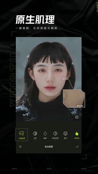 【质感肤质 一键美颜】 一键操作,拥有高级质感肤质。 自然细腻不假白,轻松修出好肤色。