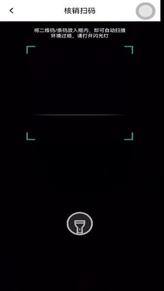 进入核销扫码界面,将二维码/条码置于取景框内自动识别;暗光环境可使用手电筒提示,提高识别成功率与速度。