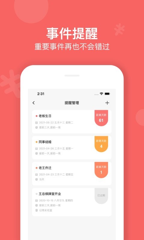 为亲朋好友的重要事件添加提醒,人情账簿app以短信的形式在您指定的时间会提醒您,不再错过重要事件。