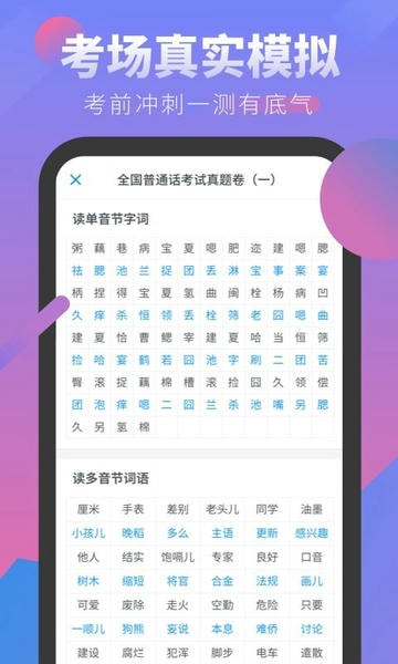 普通话考试软件是一款能够帮助你稳定通关普通话考试的学习测试app,在这里你可以接受系统化的普通话考试学习,还能够模拟真实的普通话考核,采用智能评分系统,打分真实,还有强大的纠错功能,快来试试!