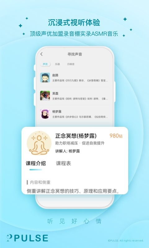 专业的,有温度的心理健康疗愈管理软件。这里有丰富的冥想课程,有助于减轻压力,提升专注,实现深度的自我疗愈。更有众多人气声优在线,为用户打造多场景的解压、放松空间。Pulse愿意成为你栖息之所,在这里与你一起硬核面对世界,温和面对自己!帮助你获得健康的生活方式。