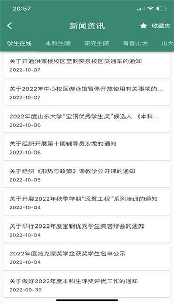 轻量设计:清爽卡片式信息流,专题栏目(学生在线、本科学院、研究生院、青春山大等)一滑即阅。