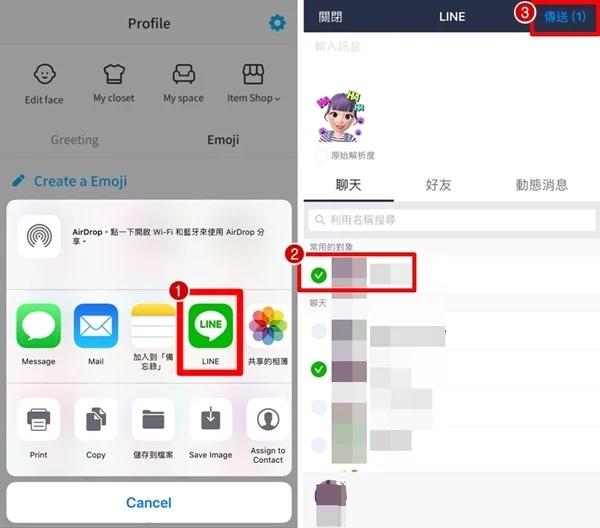 3、点贴图后【LINE】→【选择要传送的对象】→【传送】。