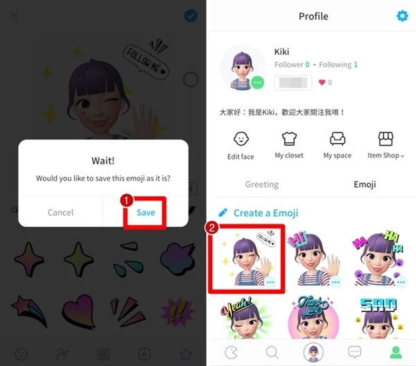 2、【Save 储存】→【自己做的表情贴就出现啦】;