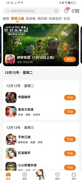 1、下载安装好软件后,完成实名认证后,来到软件主页面,在首页会给大家推荐超多的热门游戏,点击【即将上线】,就能了解近期即将上线的游戏详情,方便的大家获取最新的游戏动态,即使预约自己感兴趣的游戏;