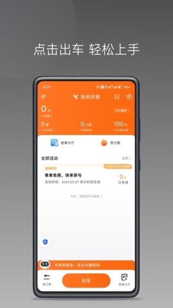 司机可在抢单大厅选择适合的订单,点击“出车”按钮一键开始运力投放,简化运营流程,提升工作效率。