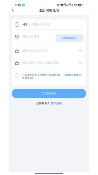 司机首次使用时可通过简单操作完成账号注册,系统支持多种角色身份选择,使不同类型的用户能够获得专属定制功能页面,注册流程简洁方便,保障用户顺利进入平台。