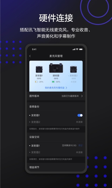 APP搭配讯飞智能无线麦克风使用,支持权益激活、声音美化、OTA升级、增益调节等内容