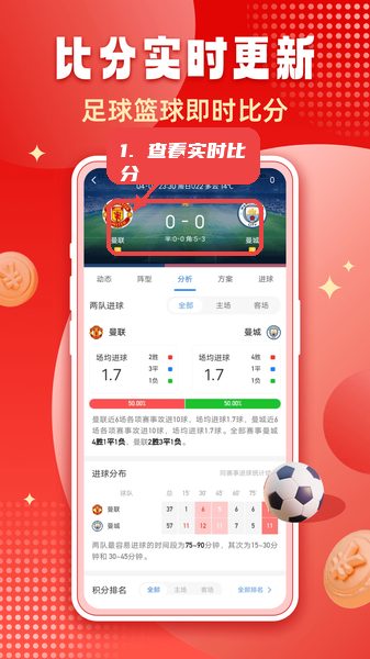 进入实时比分页,关注比赛的实时进展,包括进球情况、半场比分和角球数,保证第一时间掌握赛场动态。