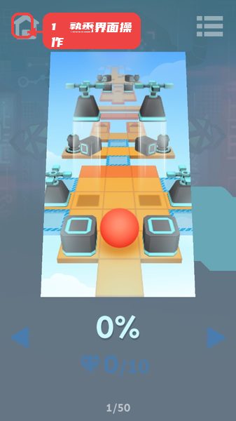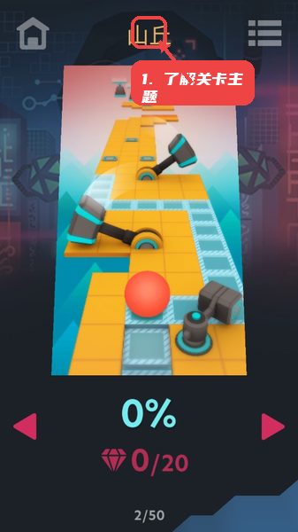 进入游戏首页,注意左上角主页按钮和顶部进度显示,底部左右箭头是控制球体滚动的主要方式。先尝试简单关卡适应操作节奏。