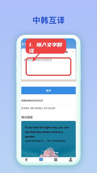 进入首页后,找到显眼的翻译输入框,直接输入需要翻译的中文或韩语句子,系统会立即显示对应的译文,适合快速文本查询和转换。
