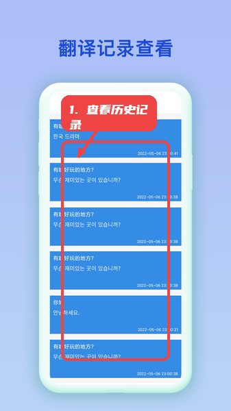 应用内设置了翻译记录查看页面,用户可以轻松浏览之前的翻译内容,记录中同时显示原文、译文及翻译时间,帮助用户随时回顾和复查。这个功能对韩语学习者来说尤为重要,有助于积累词汇和句型,避免重复查询,提高学习效率。
