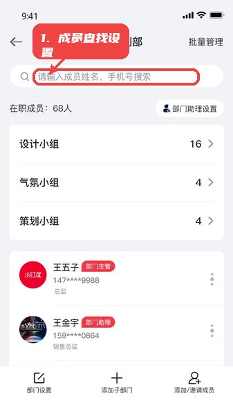 在部门成员管理界面,用户可以通过姓名或手机号搜索成员,快速定位需要管理的人员,同时对部门助理进行权限配置,确保团队分工合理。
