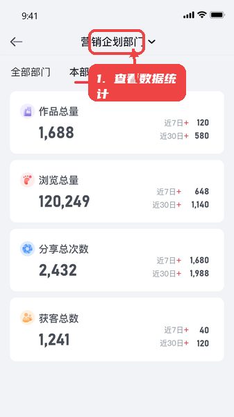 统计页面主要展示作品数量、分享总量、浏览人数和获客数据,用户可通过部门切换查看不同团队的业务表现,帮助调整管理和营销策略。