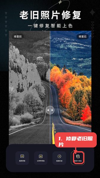 进入“老照片修复”功能,选择需要修复的旧照片,应用将自动进行修复和智能上色,完成后可保存或继续调整。