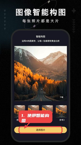 在主界面选择“图像智能构图”模块,点击“选择图片”上传照片,应用会提供多种构图方案,用户可挑选并直接保存优化后的图片。