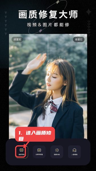 打开应用后,在主界面找到并点击“画质修复”按钮,即可上传需要处理的图片或视频,进入具体的画质优化页面。