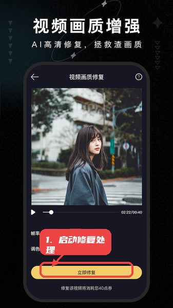 上传素材后,根据提示调整相关参数或直接选择默认设置,点击“立即修复”按钮开始AI自动修复,画面将得到清晰度和细节的提升,部分操作可能会消耗应用内的点券。