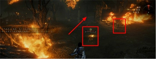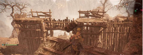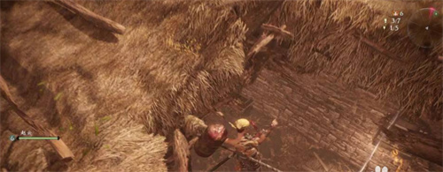 继续向前面走几步后,就能发现第二面牙旗,对面的平台会直通往山底下,也就是之前所提到的,位于右侧的路线。从右手向侧面走后来到了村庄的门口,在门前会将成功拾起,拿到后即可装上。