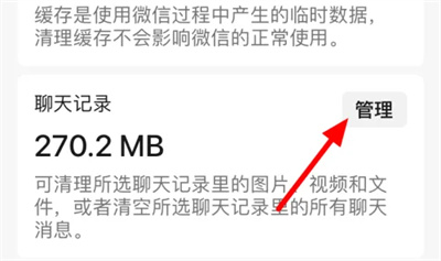 4. 在存储空间页面里找到“聊天记录”,并在它的后面点击“管理”按钮打开进入。