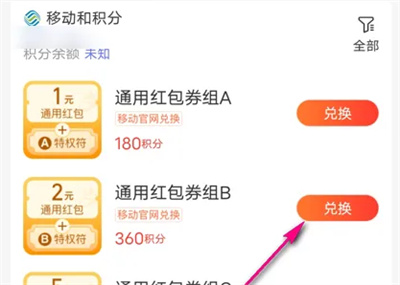 2.来到活动页面后,往下划动屏幕,找到“移动和积分”,在它的下方就会看到有可以兑换的红包选项了,每个选项下面显示有所需积分,当自己的积分足够时点击后面的“兑换”按钮。