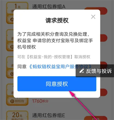 3. 当页面里弹出一个请求授权的窗口时,在其中点击“同意授权”按钮进入后就可以对自己感兴趣的商品进行兑换了。