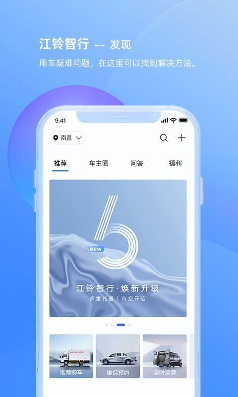 江铃智行采用新一代的汽车电子系统,先进的移动通讯网络,导入专业的tsp系统,电子商务应用,会员综合服务。为车主在车辆使用的全生命周期提供全新的智能化服务与个性化服务,为您的爱车开启智能驾驶时代新生活,您可通过app时时享受对车辆的远程控制、远程查询、远程体验、远程安防等功能服务,畅想“互联网+”为您带来的乐活体验。